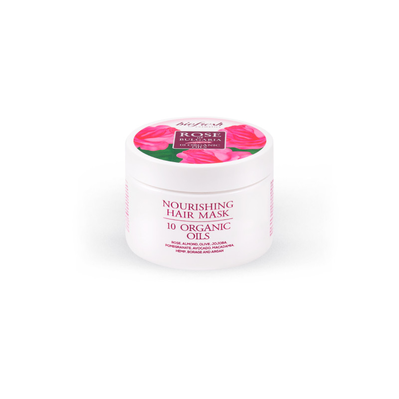 vyživující maska na vlasy s růžovou vodou, pšeničným extraktem, D-panthenolem a 10 organickými oleji k ošetření poškozených vlasů.